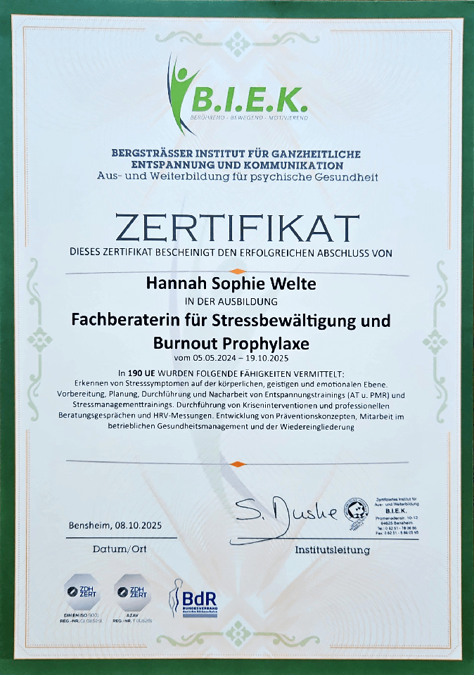 - Stressbewältigung und Resilienzaufbau: Du entwickelst individuelle Strategien für effektive Stressbewältigung und stärkst deine Widerstandsfähigkeit. So erreichst du langfristig körperliches und mentales Wohlbefinden.