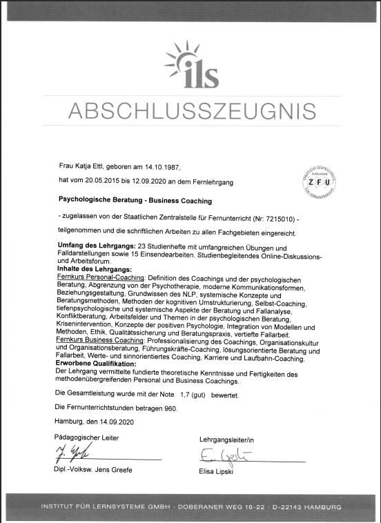 Als zertifizierte Systemische Personal- & Business Coachin (ILS Hamburg, ZFU-zertifiziert)
