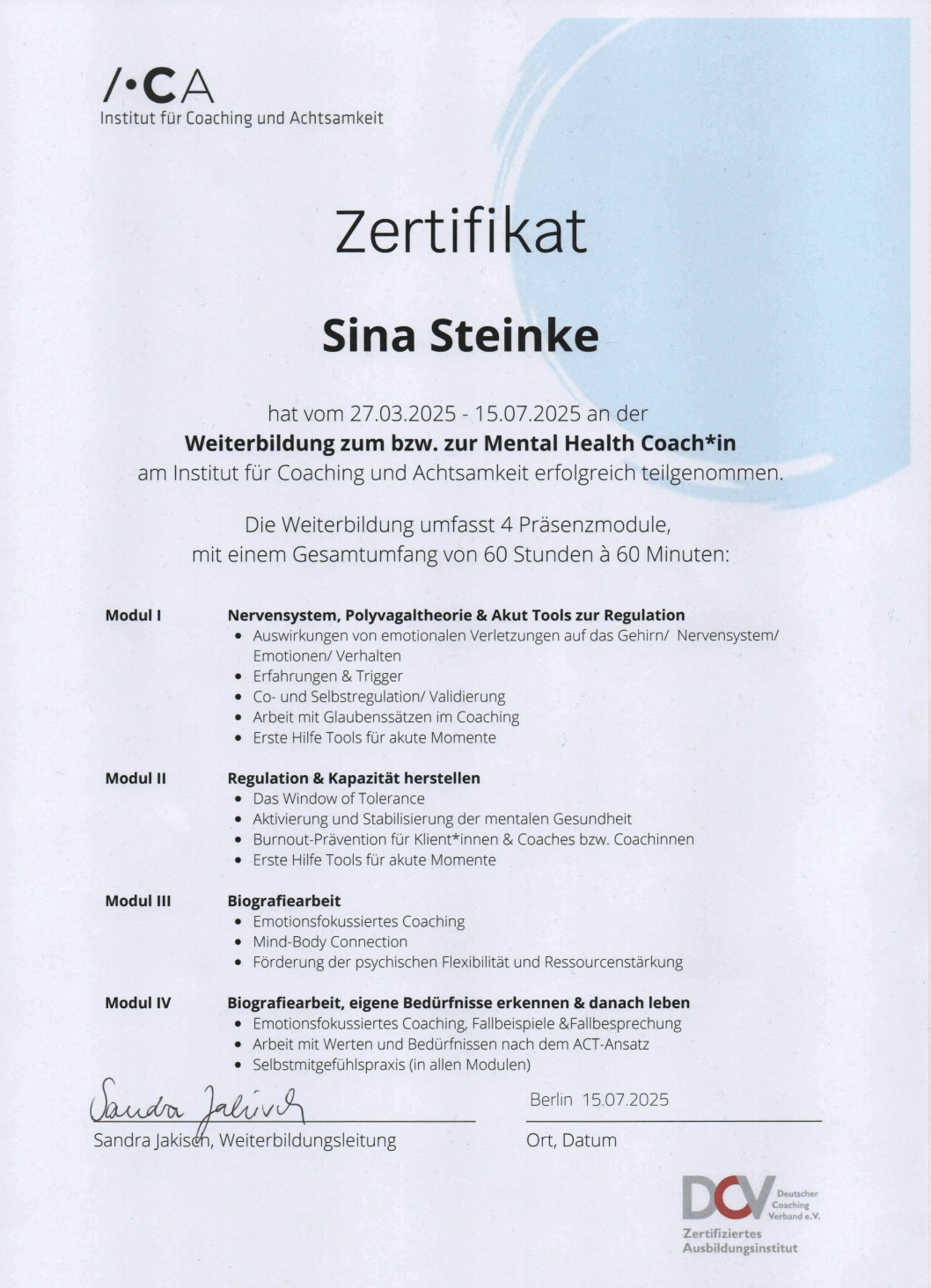 Ich bin Sina Steinke – systemischer Coach, Mental Health Coach und Vereinbarkeitsmanagerin. Ich begleite Menschen, die zwischen Beruf, Familie und Selbstanspruch nicht nur „funktionieren“, sondern wieder echt bei sich ankommen wollen.