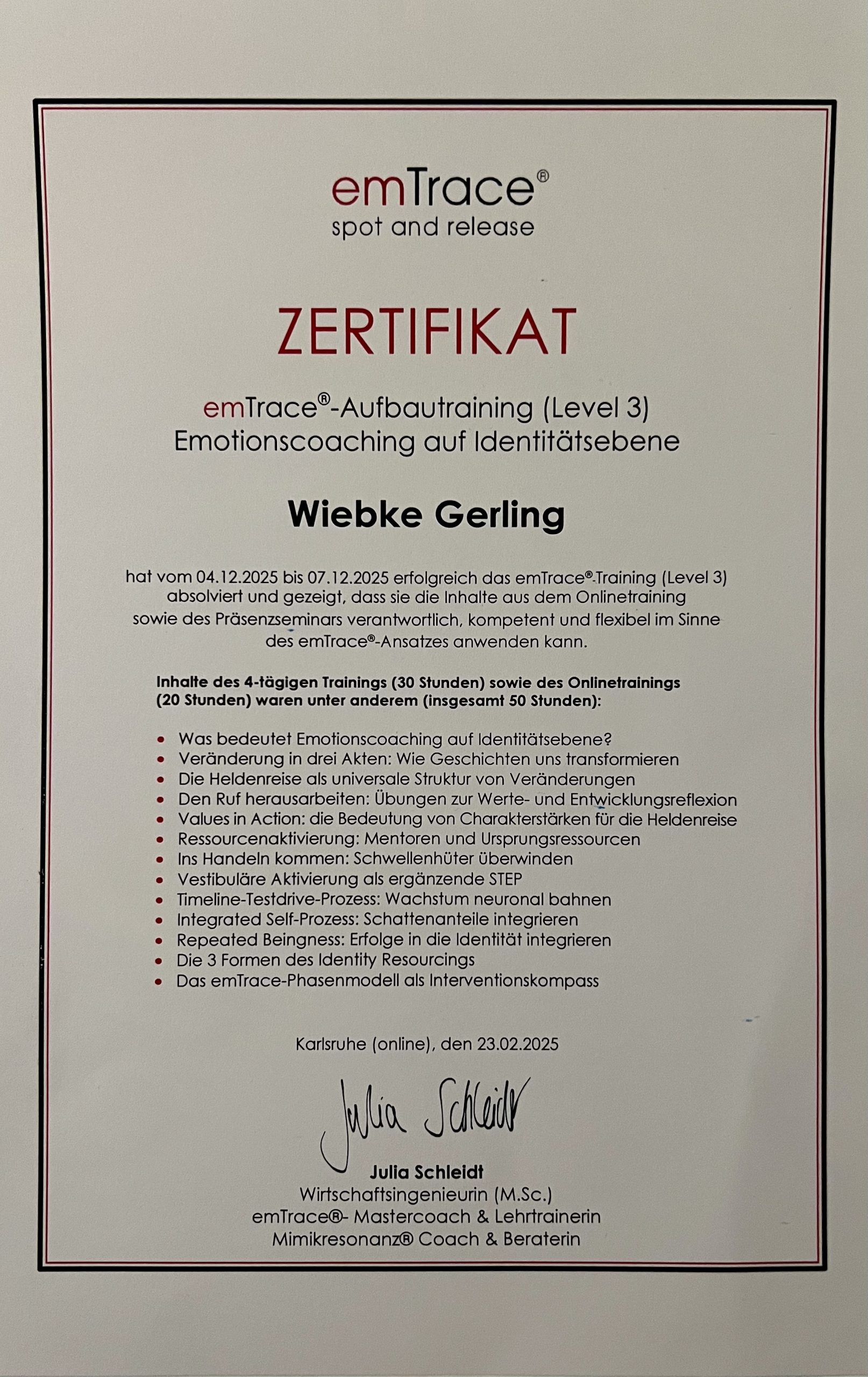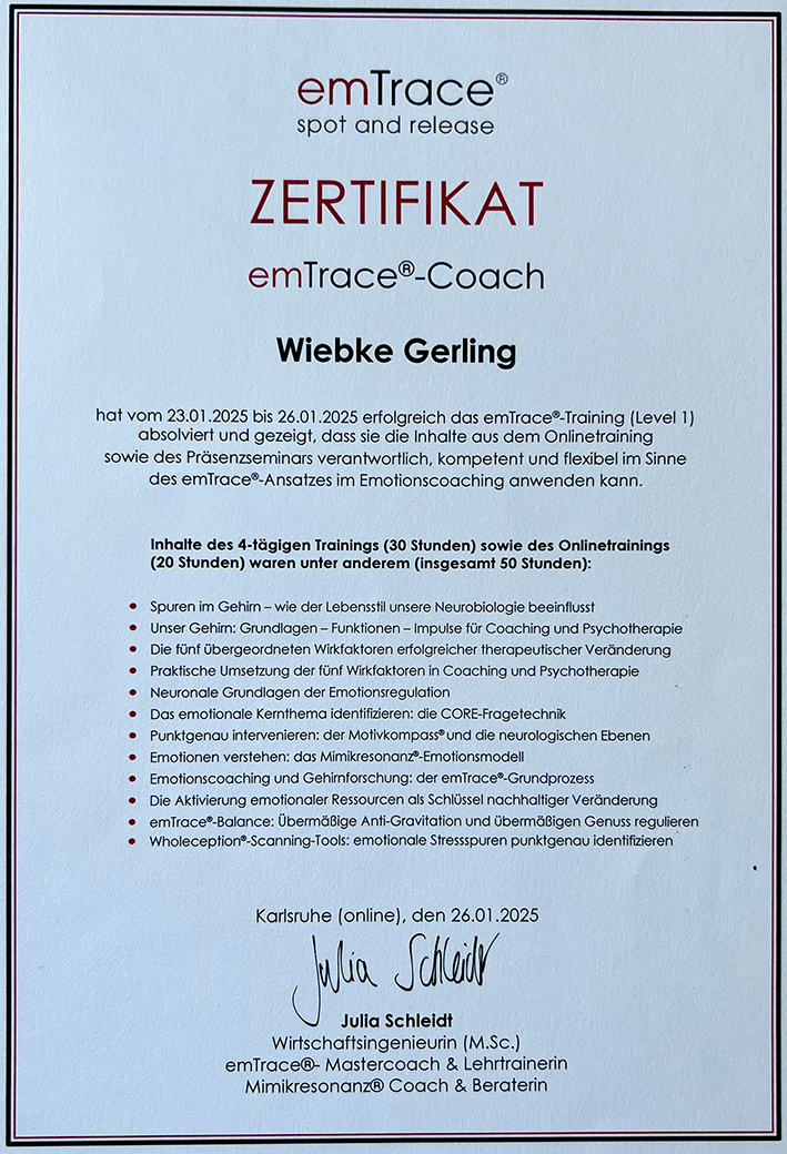 In meiner Arbeit begleite ich Menschen, die nicht einfach “funktionieren”, sondern sich wirklich spüren wollen. Ich arbeite integrativ mit dem emTrace®-Ansatz — einer neurozentrierten Methode, die aktuelle Erkenntnisse aus Hirnforschung, Traumatherapie und Emotionspsychologie verbindet. Dabei geht es nicht um “höher, schneller, weiter”, sondern um echte Selbstführung: emotional präsent sein, innere Blockaden wandeln und den eigenen Weg klarer sehen.